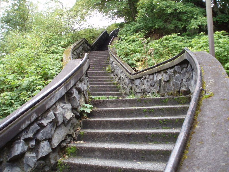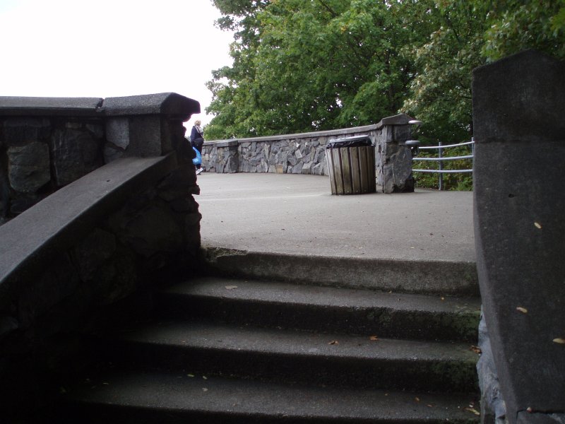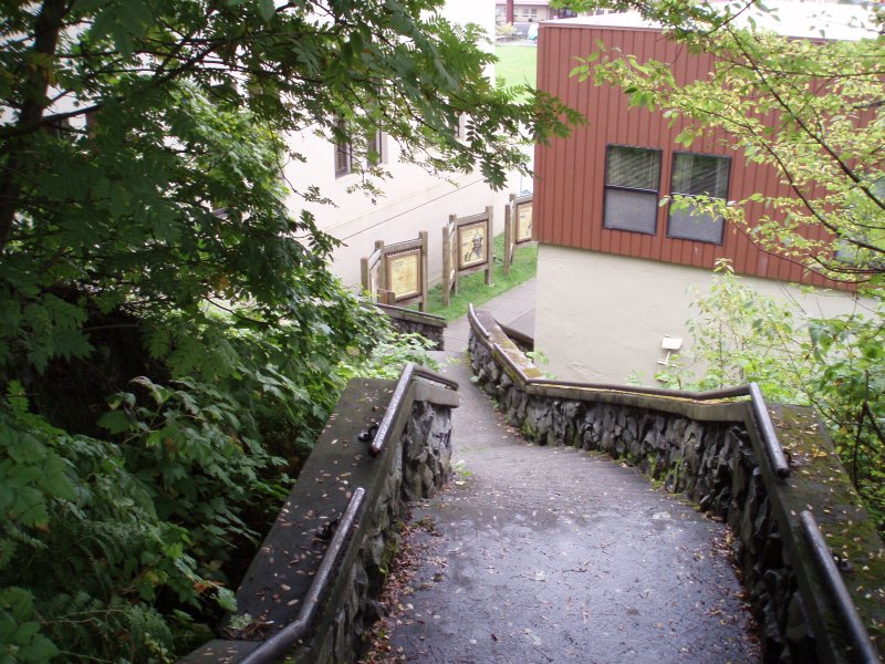 Looking beyond the dolls in the window, you can see the lines of fragile and decorative curios stretching off into the distance. As we got back to the Totem Square area, past the last of the shops, near the old post office there was this path leading by a string of signs—containing historical information about the Alaska Purchase and the buildings that had once been on Castle Hill— and on to a set of concrete stairs. The stairs took us to the top of Castle Hill.