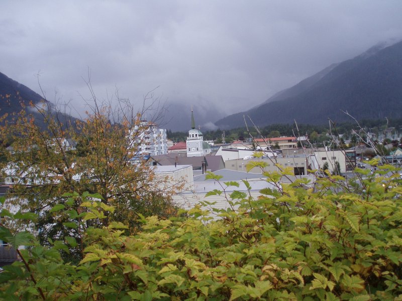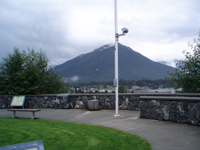The mountains of the Tongass Forest look as if their clouds haven't shifted a bit from the time when we first pulled in. Sugarloaf Mountain in the middle looks more like a giant haystack to me, but then I have seen more haystacks than I have large scale piled sugar. Harbor Drive continues on its way northeast in this photo, while Mt. Verstovia stands behind, as if unconcerned in its own world of superiority. (What possible significance could beings who have only been around for time measured in mere millennia have to one such as he, who has watched more than once as huge sheets of ice covered this land, only to retreat?)
