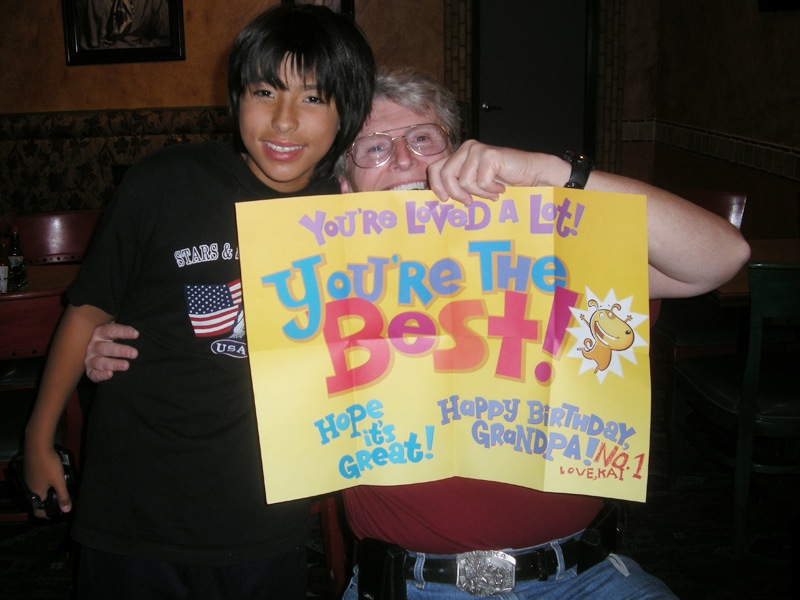 Kai got his grandpa a really nice birthday card. It started out as a normal sized card (8 inches x 5.5 inches), but it grew and grew as I unfolded more of it. There were 4 separate panels, each one twice as large as the previous one. So, number 4, the one you see me holding in the picture, was 8 times the original size! I had several nice cards this time around, including one from each of my sons that brought tears to my eyes. When I am surrounded by this much love, even turning seventy tomorrow (or based on the past rate of change, maybe later this afternoon) won't seem so bad. As the years go by, moments like these are what it is all about!