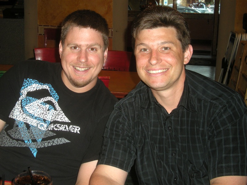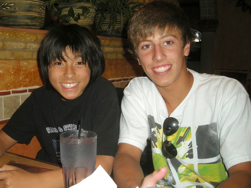 Another shot of our handsome sons. The parking lot outside was still brightly lit. We old folks have to get our partying done early, so we can be in bed when it gets dark.