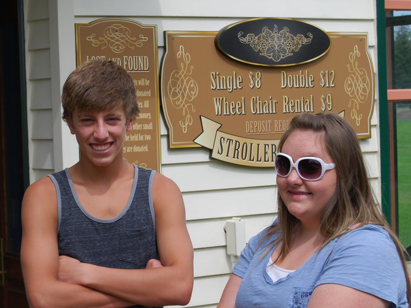 Justin, Rachel's son, brought a friend with him, a young lady who likes roller-coasters! The signs behind them shows the wheelchair rates, and indicates that this is also the "Lost and Found," which is what this building is labeled as, along with "information," on the main map of the park.