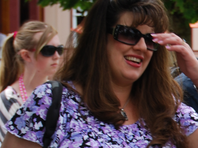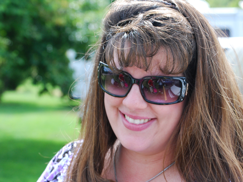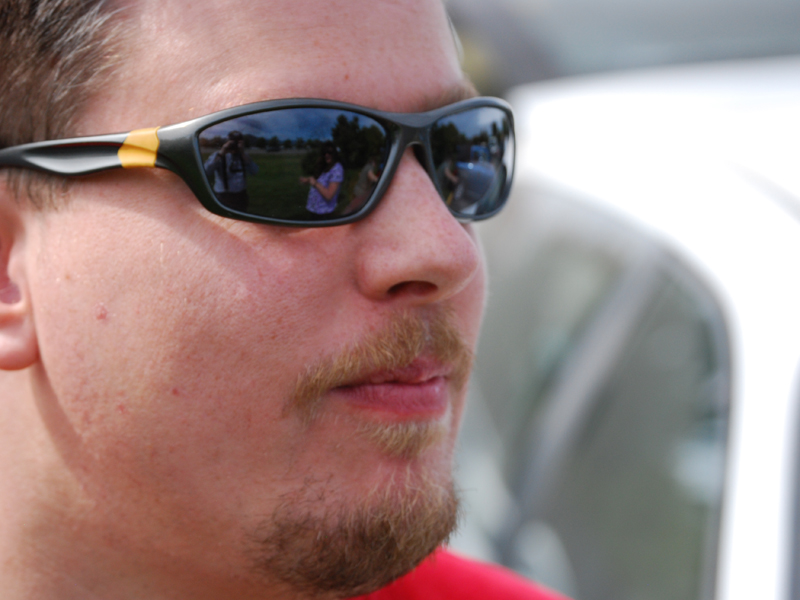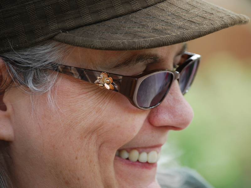 Rachel flashing her beautiful smile. Looking into her glasses you can see LeRoy, yours truly and the front of our white van, reflected in the lens.