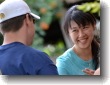 The spray is over now, but the water is still with them, because they did get wet. You can see the drops in the sun and Glenn's hands, arms and shirt, and Miho's arm and shirt seem to have a layer of water rather than just drops. Kai is mostly out of view, but he got wet too.
