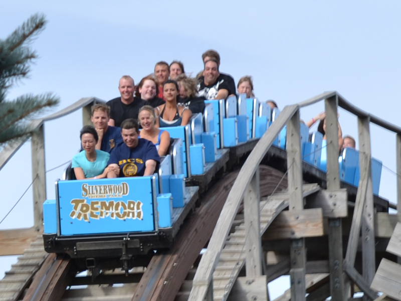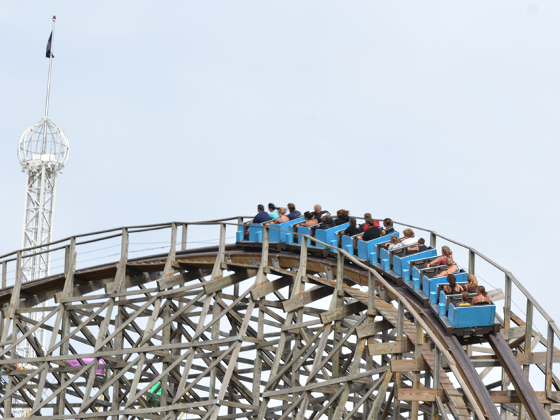 And they are off, with Glenn and Miho in the very front row! You can see the structure is all wood, just like the roller-coasters of the past.