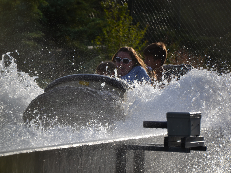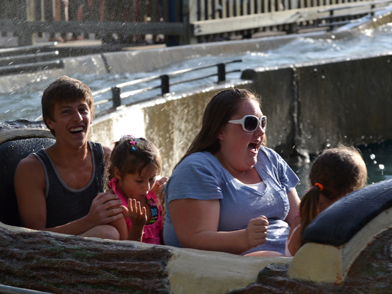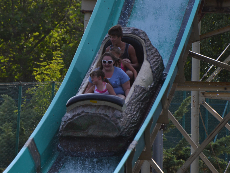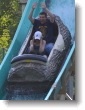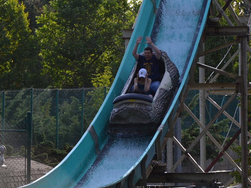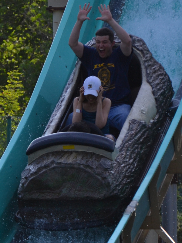 The next ride the group went to was the "Roaring Creek Log Flume." There is a little platform that is situated near the end of the ride, where, after the riders have been through the big drop of the log slide, people on the platform can drop a quarter and a spray of water would dowse the riders quite effectively.