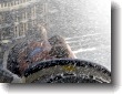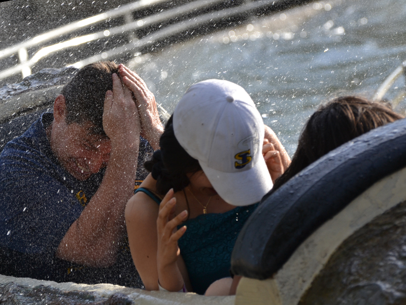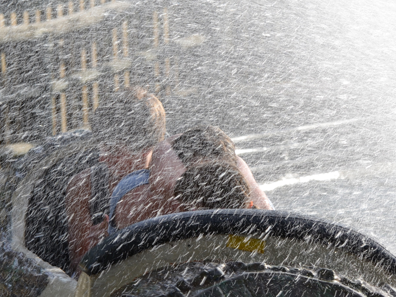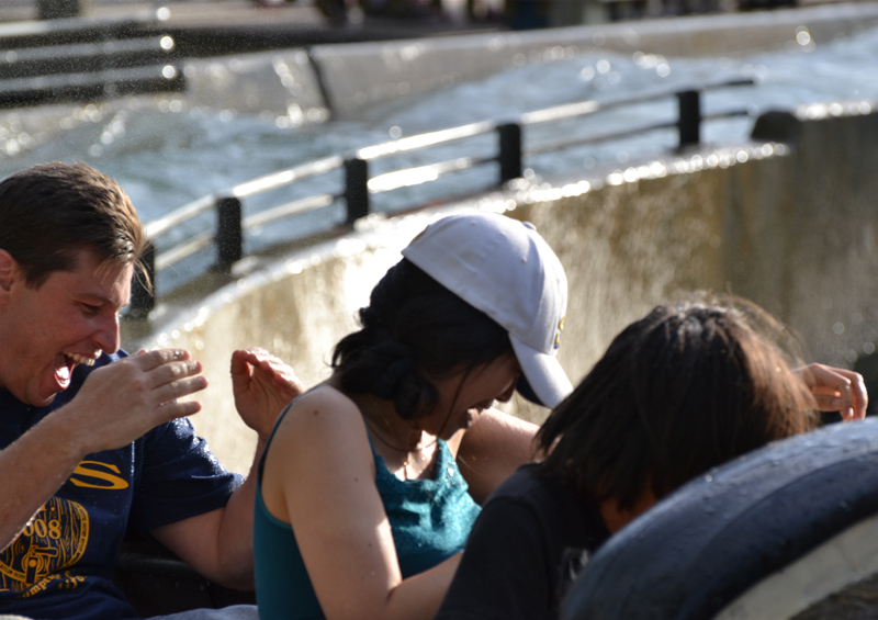 I showed the intensity of the spray above, and this is after the main water was gone. Glenn is covering up, Miho is ducking and letting the hat take the water, and Kai is hunching forward.