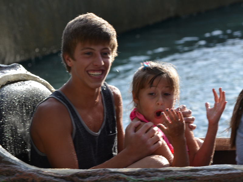 But first there were the other kids! Justin was at the back of the log boat, with Sarah directly in front of him. Then came Justin's friend, and in the very front was Sarah's friend. In this photo they were nearing the bottom of the log slide, and moving along pretty fast.