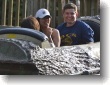 As they drop off the slide into the concrete trough, the water splashes up and gets them wet. [There is a sign at the entrance to this ride that says, "You will get wet on this ride!"]