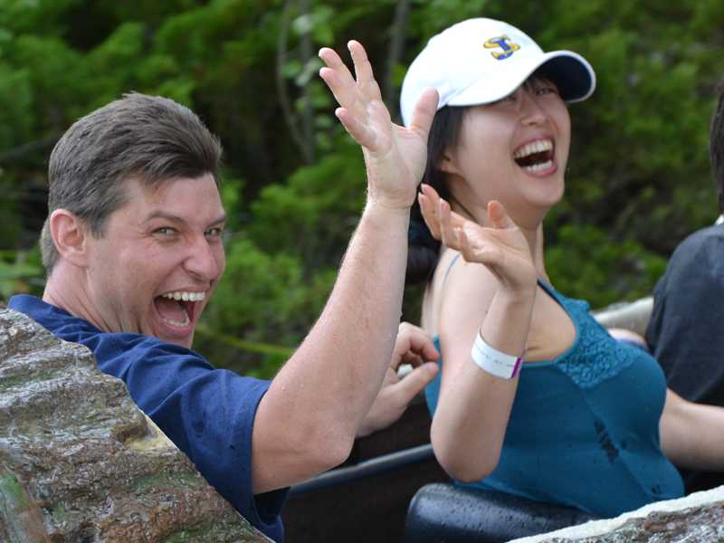Here come the Coons! Glenn has his hands in the air, and Miho is holding onto Glenn's hat, which he loaned to her for the ride, so it wouldn't blow off. Kai is ducking to keep the water off his face as they fall.
