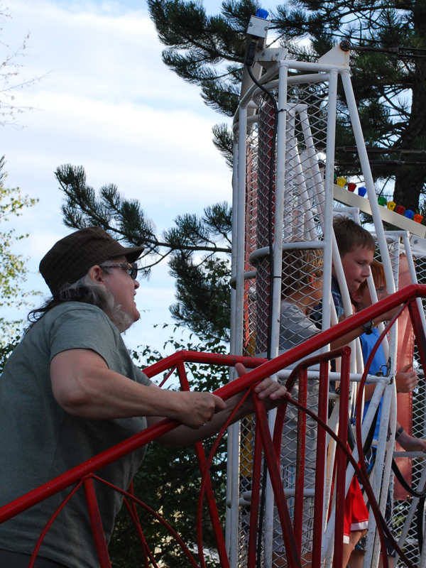 Off in the distance, you see a white tower, which is part of Dotti's favorite ride, when she is healthy: Panic Plunge. People are run up to the top of it and then dropped, only slowing down when they get very close to the bottom.