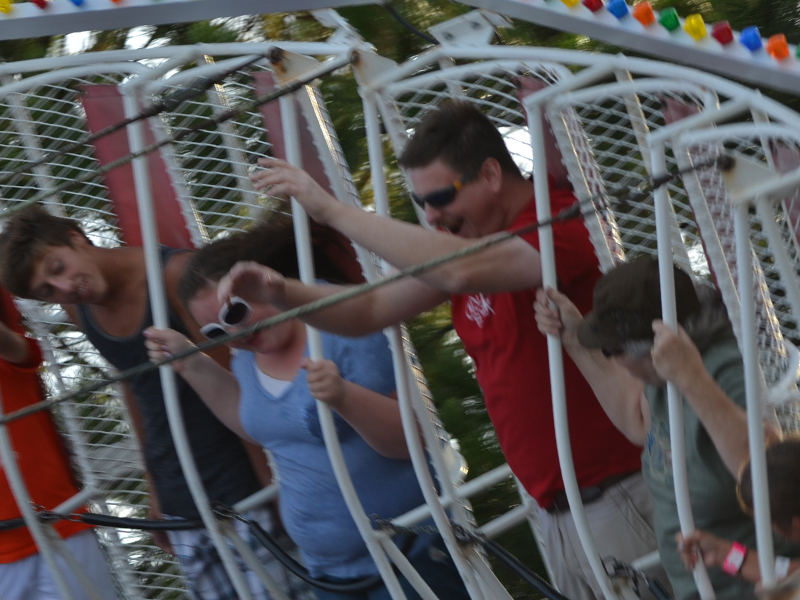 First the ride had to spin up a bit, to get to speed and then they lifted it up into the air standing the wheel more up on edge. This gave me a chance to snap some pictures as they were up in the air and looking more or less back in our direction. Here you can see part or all of the 5 members of our group who were on the ride. LeRoy was having entirely too much fun clowning around.