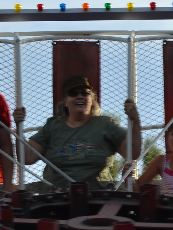 Dotti wanted to ride the Super Roundup. This is a spinning ride that pastes you to the outside wall with centrifugal force. She has ridden it many times before, but she now had one artificial hip that was healing up and a bad hip that needed to be replaced. I really didn't feel good about her riding this one. If something went bad, there would be no stopping the ride in the middle to let her off. But Dotti is a free spirit and she wanted to ride it, and what could I do?