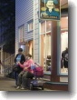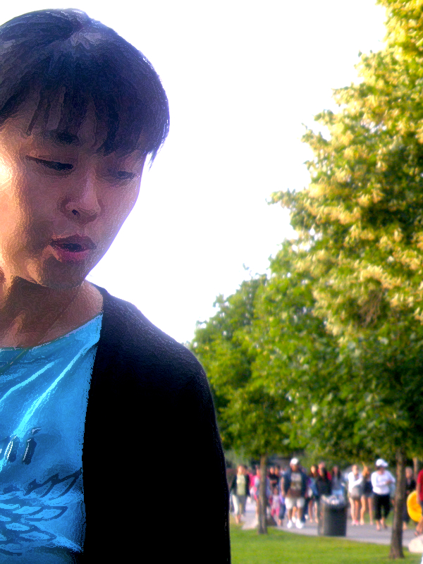 I started with a photo I took of Miho, when we were just arriving at the coffee shop. I converted her image to a painted representation of my daughter-in-law, leaving the background untouched, with the people walking by coming out of Boulder Beach.