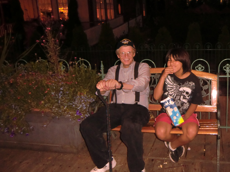 The next "fight" they took on was the wooden roller-coaster Tremors. The line was fairly long, so Grandpa hit the park bench for a rest.