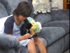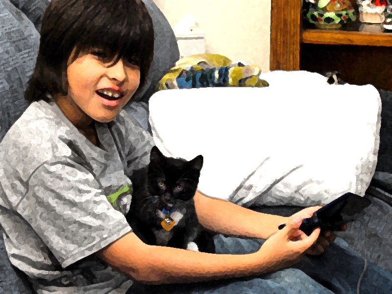 We have to begin with a little background. When we asked my son Glenn, if Kai was allergic to cats, he got a quizzical look on his face and replied that he didn't know. Although Kai has been to the musical CATS he had not been exposed to any real live cats before. So, we had to give it the acid test when we got them home and exposed them to Frostbyte. There fortunately was no problem with allergies, thank goodness, but Kai was a bit afraid of getting scratched or bitten. He was not eager to have anything to do with Frostbyte at first. But all that was to change!
